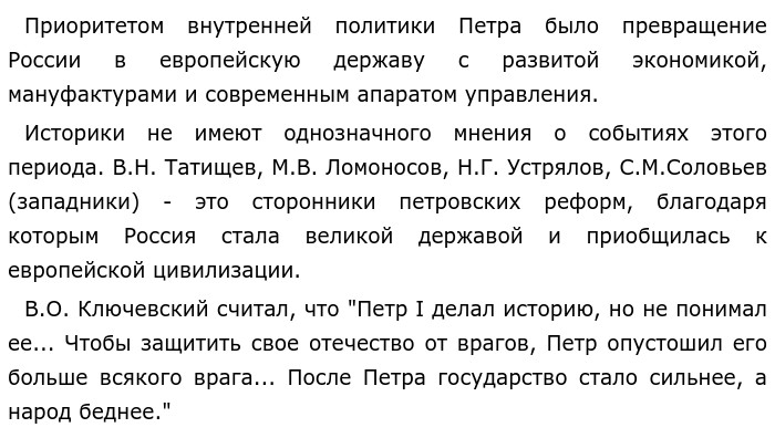 1682-1725 гг. Период правления Петра I (ЕГЭ по истории)Оценка эксперта внизу 1682-1725 гг.- это период правления Петра I. Данный отрезок времени характеризуется активной внешней политикой ( Северная война 1700-1721 гг.; Азовские походы 1695-1696 гг.) и внутренними преобразованиями, которые затронули все сферы жизни общества (государственно- административные реформы; военные реформы.) Одним из важнейших событий этого периода стала Северная война (1700-1725 гг.). Одной из причин этого события было стремление Петра I добиться выхода к Балтийскому морю, на котором господствовала Швеция. Следствием этого стало создание Балтийского флота. Второй причиной Северной войны была необходимость развития морской торговли с Европой, следствием этого стало создание русских портов на Балтике. Ключевым событием этой войны стала Полтавская битва (1709 г.). В этом сражении большую роль сыграл А.Д.Меншиков. Он принял на себя первый удар противника и известил царя о наступлении шведов, а также разгромил целые подразделения шведской армии и пленил генерала Шлиппенбаха. В результате Северной войны был подписан Ништадский мирный договор (10 сентября 1721г.), который открывал для России "окно в Европу". Петр I сам активно принимал участие в Северной войне, в ходе которой были присоединены Карелия, Ливония, южная часть Финляндии и открыт выход к Балтийскому морю. Укрепляя свои позиции на Балтике, Петр I приступает к строительству Санкт-Петербурга, что также было немаловажным событием этого времени. Первой причиной этого события была необходимость построить порт на Балтийском море для торговли со странами Европы кратчайшим путем. Следствием этого стало то, что Санкт-Петербург будет очень важным торговым городом и в будущем столицей империи. Второй причиной была близость к фронту Северной войны. Следствием этого стало возведение форпоста для борьбы со шведами. Важнейшую роль в этом сыграл Доменико Трезини, который спроектировал Петропавловский собор, здание Двенадцати коллегий, согласовал строителей для исполнения работ. Правление Петра I нельзя оценить однозначно. С одной стороны, деятельность Петра несла и разрушительный характер. Пример тому- строительство кораблей, Санкт-Петербурга, рекрутские наборы, войны. Все это унесло жизни тысяч людей. Но с другой стороны, деятельность Петра Первого была направлена на устранение экономической и культурной отсталости страны. ![]() Обновлено: Опубликовал(а): Ekspert Внимание! Спасибо за внимание.