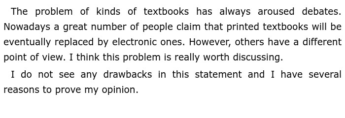 Printed textbooks will be eventually replaced by electronic ones с переводом (Сочинения ЕГЭ английский язык)![]() To start with, printed textbooks require a lot of paper. It is unprofitable for the environment because paper is made of trees, while electronic books do not require special costs. In addition, printed textbooks take up a lot of space, while in one e-book person can download several works. Moreover, printed textbooks cost more expensively than electronic ones.