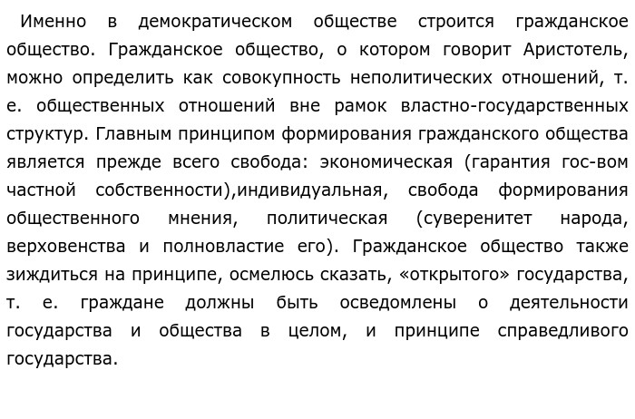 Аристотель: «В гражданском обществе находится главный центр человеческой свободы» (ЕГЭ обществознание)Древнегреческий философ высказывает идею сущности гражданского общества в условиях демократического режима правового государства. Обратимся к теории, демократия — это способ политической организации общества, его политический режим, при котором народ или его большинство служит источником и носителем политической власти. Демократическое государство в отличие от тоталитарного и авторитарного отличается прежде всего свободой, свободой человека, которые проявляются в таких признаках как: народ как источник власти (граждане формируют законодательные органы власти, свободные выборы (граждане сами принимают решения на выборах), наличие независимых СМИ, многопартийность и т. д. все эти признаки базируются на принципе человеческой свободы. ![]() ![]()