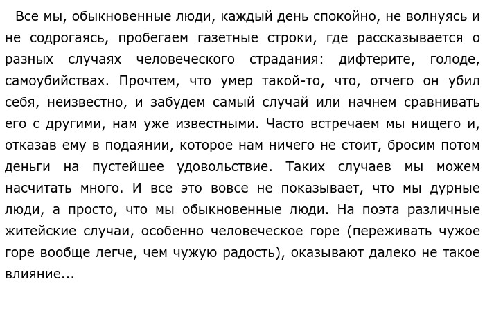 Теперь мы можем сделать вывод, что главной общей проблемой и для общества девятнадцатого века и для общества двадцать первого века является малодушие, бездуховность и от того всепоглощающая безнравственность, иными словами, в сердцах людей перестает жить Бог. Сейчас очень мало тех, кто уделяет время духовному воспитанию и от того слишком много тех, кто творит нравственные и иные преступления. Человек, несомненно измельчал. Даже там, в далеком девятнадцатом веке он ещё задумывался над тем ,что такое добро и что такое зло, теперь же мы научились оправдывать это зло, свои грехи, мешать черное с белым. Как же решить эту глобальную проблему? Да, за один день нельзя поверить в Бога, но людям нужно хотя бы начать думать о нем, думать о том, что существует наказание гораздо страшнее тюремного срока или административной ответственности и что даже самые суровые законы не в силах усмирить греховную человеческую сущность, разве что сдержать на какое-то время. Я считаю, что начать всеобщее исправление нужно с разрушение главенствующего в нынешнем обществе лозунга «возлюби себя» и заменить его на другой «полюби ближнего своего как самого себя» (10 заповедей из Библии, вторая заповедь). Ведь любящие только себя люди переступают через всех, глумятся над чужими бедами и зачастую не уважают никого, кроме себя. Бывает идешь по улице и видишь, вот он «настоящий человек», едет куда-то по своим делам, на какой-нибудь новенькой иномарке и задрав подбородок к небу с высокомерием смотрит на бедную старушку, а про себя думает «я право имеющий»… Все знают, что в нашей стране буквально пропасть между богатыми и бедными, а среднего класса и двадцати процентов не наберется, не задумывались ли вы от чего так? Да, разумеется это все наша «элита», скажете вы. Депутаты, президенты. Всем хочется власти, всем хочется богатства, и что тогда говорить об этой «элите», если даже мы, простой народ питаем зависть ко всем, кто живет хоть немного лучше нас. Зависть является грехом не меньшим, чем гордыня и она так же убивает человека в человеке, мы лишаемся нравственности. И чтобы это предотвратить, всем нам нужно очень сильно постараться и наконец заняться своим нравственным и духовным воспитанием. Не стараться сделать другому плохо, а относиться к нему так, как хотите, чтобы он относился к вам. «Полюбите врагов ваших» говорит нам святое благовествование от Матфея, потому что только любовью и только добром можно победить любое зло в этом мире. Обновлено: Опубликовал(а): Анастасия Гутче Внимание! Спасибо за внимание. Полезный материал по теме