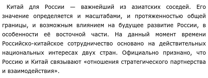 Российско-китайские отношения моими глазами (Сочинение на свободную тему)Несомненно, каждый человек, который решает связать свою жизнь с Востоковедением и с Китаем в целом, имеет на это определенные причины. Опираясь на свои интересы, ещё в 16 лет мной было принято решение изучать китайский язык и углубиться в историю и культуру Китая. Современная молодежь узнаёт многое об Азии из продуктов медиа среды (фильмы, сериалы, музыка и др.) Я не являюсь исключением, ведь ещё с 13 летнего возраста, я нашла новое для себя увлечение — прослушивание китайской и корейской поп-музыки и просмотр сериалов. Отличие наших народов, манера речи, поведение, общение людей между собой, традиции и культура стран Востока сразу же вызвали неподдельный интерес. Именно эта заинтересованность в совокупности с развивающимися Российско-китайскими отношениями и привели меня в Казанский Федеральный Университет на направление Востоковедение и Африканистика с углубленным изучением основного восточного языка — китайского.