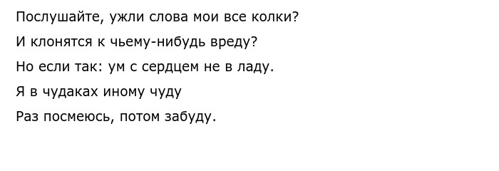 Чацкий возбуждён и воодушевлён долгожданной встречей, он гораздо более многословен, чем Софья. Он открыто показывает все свои душевные порывы (“с жаром целует руку”), очень доверительно вспоминает их старых общих знакомых, над которыми раньше они подшучивали вместе. Он ожидал снова встретить свою единомышленницу, понимающую проблемы Московского общества и также, как и он, относящуюся к этим порокам с лёгкой добродушной насмешкой. Чацкий никого не хотел обидеть: ![]()