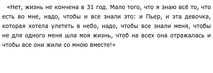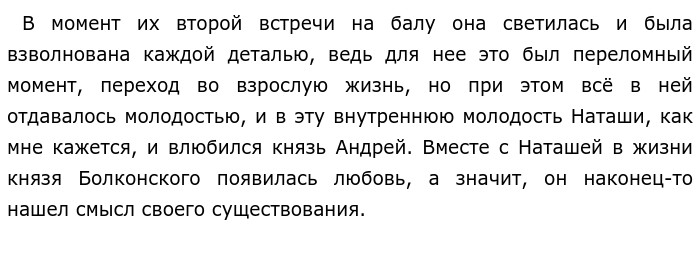Я думаю, что Толстой «завершил» отношения Наташи Ростовой и Андрея Болконского на этом этапе, чтобы их любовь осталась навечно пылкой и страстной. Когда люди вступают в брак и создают семью, со временем всё в их отношениях становится обыденным. Семейная жизнь, которую выбрала Наташа с Пьером после смерти Болконского, была неподходящей для князя Андрея. У него уже были отношения, и всё в его любимой женщине стало ему неинтересным и надоедливым, как только он женился на ней. Не такой конец отношений Наташи и Андрея Болконского хотел видеть Толстой.