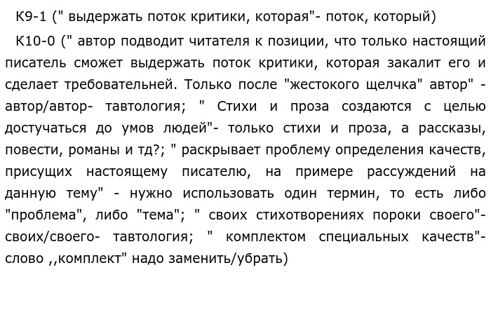 Проблема определения качеств, присущих настоящему писателю (ЕГЭ по русскому)Оценка эксперта внизу Как писатели создают произведения? Через что они проходят, чем жертвуют ради этого? Ответы на эти вопросы можно найти в тексте В. Вересаева. В предложенном для анализа тексте писатель раскрывает проблему определения качеств, присущих настоящему писателю, на примере рассуждений на данную тему. В. Вересаев акцентирует внимание читателя на том, что "Писатель должен не наблюдать жизнь, а жить в жизни, наблюдая её не снаружи, а изнутри", то есть живо чувствовать все проблемы общества, искать пути их решения. Этот пример доказывает то, что многие поэты и писатели разных времён обличали в своих стихотворениях пороки своего времени, "доставая" их из общества. Кроме того, автор текста обращает внимание на то, что писательство не должно быть первостепенным делом в жизни человека: "Нужно в жизни жить, работать — инженером, врачом, педагогом, рабочим". Аргументирует он это тем, что лучше писать "немного, но полноценно". С помощью этого примера В. Вересаев показывает, что хороший писатель должен писать качественно, при наличии сильного желания создать что-либо стоящее, а не брать количеством. Оба примера, дополняя друг друга, ясно дают понять, что автор текста выделяет в группу писателей тех людей, которые обладают особым набором качеств. Также автор подводит читателя к позиции, что только настоящий писатель сможет выдержать поток критики, которая закалит его и сделает требовательней. Только после "жестокого щелчка" автор сможет писать по-настоящему сильные произведения. С авторской позицией нельзя не согласиться. Стихи и проза создаются с целью достучаться до умов людей. Только по-настоящему серьёзные произведения смогут достичь этого. Вспомним призыв божьего гласа к лирическому герою стихотворения А. С. Пушкина "Пророк": "Восстань, пророк, и виждь, и внемли... Глаголом жги сердца людей". Пророк, то есть писатель, обладает даром доносить важные слова до народа. Таким образом, истинный писатель должен иметь особые способности вместе с комплектом специальных качеств, чтобы создавать по-настоящему великие произведения. Обновлено: Опубликовал(а): Ekspert Внимание! Спасибо за внимание. Полезный материал по теме