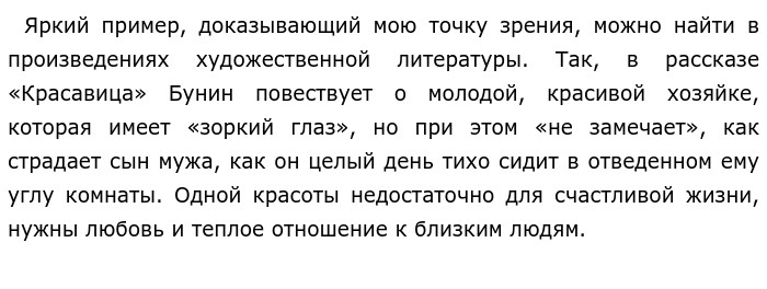 Проблема внутренней и внешней красоты. По Каверину (ЕГЭ по русскому)Борис Замятин говорил: «Внешность бывает обманчива». И порой люди делают поспешные выводы, оценивая лишь внешнюю красоту. Вениамин Александрович Каверин рассуждает в своем тексте о проблеме внешней и внутренней красоты людей. Автор повествует о лежащем в госпитале Власове, которому «с каждым днем становилось все хуже». Однако его спасают письма незнакомки, в которых написаны «советы, большей частью медицинского свойства». Именно они помогают герою преодолеть болезнь. Федя предполагает, что эти записки передает ему «маленькая, толстая, смешливая» Луша. Каверин подчеркивает, что Власов не воспринимает всерьез медсестру. Для него письма «таинственные, необыкновенные, а Луша – просто Луша». Также автор отмечает, что после поправки героя письма перестают приходить. Он узнает, что медсестра заболела. В этот момент Власов уверен, что эти записки писала ему она. И вот тогда «что-то перевернулось в его душе». Писатель акцентирует внимание читателя на то, как меняется отношение Феди к Луше. Он скучает «без ее топота и хохота» и называет ее «Лушенька». Оба примера, дополняя друг друга, подчеркивают мысль писателя о том, что внешние недостатки перестают быть значимыми, когда приходит осознание душевной красоты человека, который совершает добрые поступки. Автор считает, что внешность не способна показать, какой человек на самом деле. Важна внутренняя красота, которая заключается в поступках, которые он совершает, помогая окружающим. С мнением автора невозможно не согласиться. Действительно, внешняя красота далеко не всегда олицетворяет внутренний мир человека, поэтому очень часто у окружающих складывается неправильное мнение по поводу него. ![]()