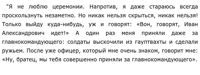 Пороки чиновничества 8 класс по комедии Ревизор (Гоголь Н. В.)События происходили в первой половине 19 века. После приезда Гоголя в Петербург, где он был зачислен канцелярским чиновником. И он хорошо был знаком с этой профессией -он пишет комедию "Ревизор". Чиновники-это общественная группа людей, призванные служить обществу. Хлестаков-это главный герой произведения. Из-за своего внешнего вида и манеры поведения, сотрудники гостиницы приняли его за ревизора. Ведь на кануне к ним должна приехать проверка. Все сразу засуетились и пытались всячеки угодить Хлестакову. Немедля предложили ему выпить, от чего он не отказался. . . Всё, что он знал про чиновников, то он и рассказывал. По его рассказам, можно было понять, что чиновники не выполняют своих обязанностей. А вместо этого любят лежать в кровати и танцевать на баллах. Любят плотно покушать и хвастаться своими достоинствами и достижениями: ![]()