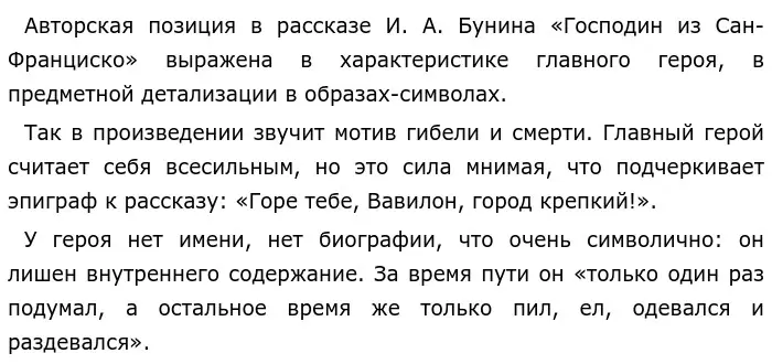 Таким образом, в произведении И. А. Бунина «Господин из Сан-Франциско» авторская позиция выражается в подробном описании различных деталей, создавая образы-символы, которые раскрывают идею и проблематику рассказа.