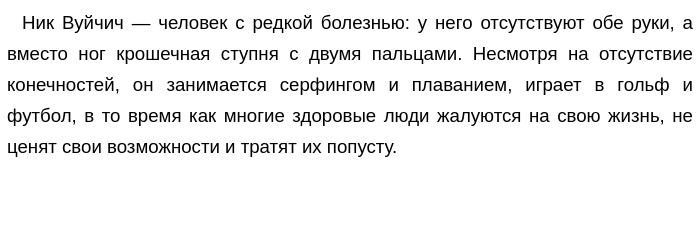 Какую роль сильная личность может сыграть в жизни общества? Аргументы М. Горький «Старуха Изергиль», биография Ника Вуйнича (Итоговое сочинение (декабрьское))Какую роль сильная личность может сыграть в жизни общества? Сильная личность — это набор качеств характера человека, которые позволяют быть лидером. Но только правильные, добрые, честные поступки на благо окружающему миру свойственны сильной личности. Когда человек переходит на сторону зла и совершает плохие поступки он показывает свою слабость, перестает быть сильной личностью. Сильная личность обладает способностью вести за собой толпы людей, несмотря ни на какие преграды и трудности, падения и боль, она будет вести до конца по пути к лучшему. Пример сильной личности можно найти в произведении Максима Горького «Старуха Изергиль». Данко, главный герой одной из легенд этого произведения, вел людей за собой к спасению, как истинный герой, вверяя надежду и уверенность, что скоро племя обретет покой и новое место. Не испугался, когда люди накинулись на него, пожертвовал ради них собой. В Данко заключены лучшие качества человечества. Он готов к самопожертвованию, искренен, умеет сочувствовать и целеустремлён, именно это доказывает, что Данко является воплощением сильной личности. Другой пример сильной личности можно встретить и в реальной жизни. ![]() Но Ник мотивируют людей никогда не сдаваться и верить в себя, на своём примере доказывая, что даже невозможное возможно. Это явно сильная личность, которая ведёт за собой других людей, даёт надежду и вдохновляет таких же как он. Благодаря приведённым примерам, мы убеждаемся в том, что сильная личность несёт благо обществу, направляет его на правильный путь. Сильные личности движут миром. Обновлено: Опубликовал(а): Снежана Шуракова Внимание! Спасибо за внимание. Полезный материал по теме