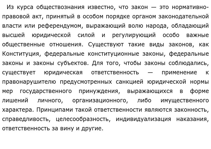«Прощая слишком много виноватому, совершаешь несправедливость по отношению к невиновному» (Б. Кастильоне) (ЕГЭ обществознание)Автор в своём высказывании говорит о равенстве закона для всех. Кастильоне также отмечает, что наказание должно быть справедливым, и каждого человек должен нести ответственность за свои поступки. Обратимся к теоретическому обоснованию высказывания. ![]() Так, в зависимости от того, в какой сфере человек совершит правонарушение (общественно опасное виновное деяние, противоречащее нормам права и наносящее вред обществу, государству или отдельным лицам, влекущее за собой юридическую ответственность), такой вид юридической ответственности он будет нести (например, административная, дисциплинарная, гражданско-правовая, уголовная и т. д.). Однако если правонарушитель останется безнаказанным, это может вызвать недовольство потерпевшего, а также и всего общества. Для подтверждения данной точки зрения приведу пример из общественной жизни. В РФ провозглашена Конституция, в которой закреплены основы общественного и государственного строя, а также прописаны права и свободы граждан как высшая ценность государства. За любое правонарушение следует наказание в соответствии с законами РФ, которые для всех равны, вне зависимости от социального статуса человека, его доходов, власти и т. д. Если же виновный попытается избежать юридической ответственности, он будет нести ещё большее наказание. Это доказывает, что в России действует принцип справедливости по отношению к правам и свободам человека, а также равенство всех людей перед законом. Также хочу привести пример из СМИ. В Интернете была опубликована статья о совершении убийства гражданином К. Убив человека, он был осужден, однако, он не понес уголовную ответственность в полной мере и остался на свободе, так как откупился. Данный пример показывает несправедливость по отношению к пострадавшему и его семье. Таким образом, автор действительно был прав в своем высказывании. Очень важно, чтобы каждый человек нёс ответственность за совершенное правонарушение и был наказан в соответствии с законом, иначе будут нарушаться права и свободы невиновных людей. Обновлено: Опубликовал(а): Kate_377 Внимание! Спасибо за внимание. Полезный материал по теме
