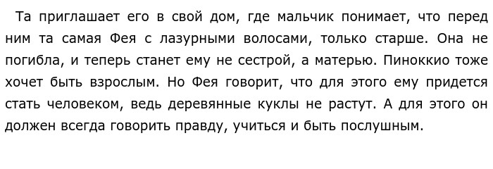 «Приключения Пиноккио» Карло Коллоди (Читательский дневник)Пожилой столяр находит говорящее полено и дарит его своему приятелю Джеппетто. Тот вырезает из полена куклу с длинным носом. Он хочет научить её петь, танцевать и показывать фокусы. Но деревянный человечек проказничает и обзывается, и Джеппетто винит в этом своего друга. Старики даже ссорятся и дерутся, но быстро мирятся. Куклу называют Пиноккио. Деревянный мальчик все время кривляется, показывает язык, пинает старого отца и срывает с него парик. По пути домой Джеппетто хочет наказать озорника, но тот бросается на землю. Прохожие обвиняют старика в жестокости, и его арестовывают. Дома у отца Пиноккио знакомится со старым говорящим Сверчком. Тот пытается вразумить мальчишку, но безрезультатно. Пиноккио хочет только бродяжничать и хулиганить. Сверчок предупреждает, что в этом случае он рано или поздно превратится в осла, и никто не будет его уважать. Мальчик очень злится и едва не убивает насекомое деревянным молотком. Но вскоре он понимает, что Сверчок был прав. Пиноккио хочет есть, но у него не получается ни приготовить пищу, ни добыть её в соседней деревне. Мальчик хочет согреться возле раскаленной жаровни и засыпает. Во сне он не замечает, что у него горят ноги. Утром Джеппетто возвращается из полиции. Он мастерит для деревянной куклы новые ноги. Также он отдает мальчику свои последние продукты — три груши. Он вырезает для сына бумажную одежду, делает обувь из древесной коры и колпачок из хлебной мякоти. Пиноккио хочет учиться, и его бедняк-отец продает куртку, чтобы купить мальчику букварь. По пути в школу Пиноккио слышит музыку, которая доносится из кукольного театра, и сворачивает туда. Чтобы попасть на спектакль, он продает свой букварь и покупает билет. Там он участвует в представлении и знакомится с другими куклами, а также с их наставником Манджафоко. Сначала тот хочет бросить деревянную куклу в огонь, чтобы поджарить барашка. Но все же он добрый человек и жалеет Пиноккио. В итоге хозяин съедает недожаренное мясо. Также из жалости к бедному старику Джеппетто, он дает мальчику пять золотых монет. Это довольно крупная сумма, которой должно хватить надолго. ![]() Разбойники хотят отнять у него монеты, но он кладет их в рот и крепко сжимает зубы. Укусив Кота, Пиноккио вырывается и убегает. Впереди виден маленький белый домик. Деревянный мальчик стучит в дверь. ![]() Фее жаль деревянную куклу. Она велит своим помощникам вынуть несчастного из петли и уложить в постель. Она собирает возле больного консилиум, в котором участвуют Ворон, Сыч и тот самый Сверчок из дома Джеппетто, который выжил после удара молотком. Они приходят к выводу, что больной жив. Несмотря на сопротивление мальчика, ему дают выпить отвратительное лекарство. Фея требует, чтобы Пиноккио рассказал ей всю правду о себе, но тот лукавит. Во время каждой лжи его длинный нос увеличивается в размерах. В конце концов нос удлиняется настолько, что Пиноккио не может пройти в дверь. Фея говорит, что он будет расти каждый раз, когда мальчик соврет. Посчитав, что урок усвоен, Фея призывает тысячу дятлов, и те быстро приводят нос в порядок. Фея хочет, чтобы мальчик стал ей братом, и предлагает ему переселиться вместе с отцом в её домик. Пиноккио нравится эта идея. Он идет за Джеппетто, но по пути снова встречает Лису и Кота. Он по