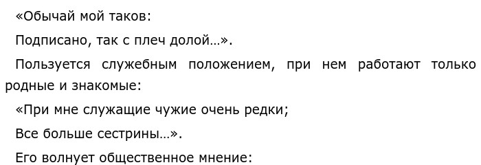 ![]() Он, как и большинство из его окружения, любит богатства, чины и прочие материальные блага: «Дай Бог здоровья вам и генеральский чин…», но работу свою выполняет безответственно: ![]()