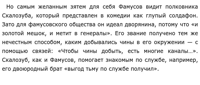 Хочет, чтобы у его дочери Совьи был все самое лучшее. А лучшее, в его представлении, может дать ей только такой же, как он сам, богатый и знатный муж: «Не надобно другого образца, Когда в глазах пример отца». Ему вообще всё равно за кого отдать Софью замуж. Главное, чтобы жених был обеспеченный: «Кто беден, тот тебе не пара», «Желал бы зятя он с звездами, да с чинами…». ![]() И никого из друзей и знакомых не интересует, что Сергей Сергеевич глупый, меркантильный, совершенно не разносторонний и вообще неприятный в общение. Конечно, ведь им абсолютно без разницы на нравственность, главное — материальное положение. Поэтому Скалозуба и считают идеалом дворянина. Деньги, чин есть — ума не надо. Вот девиз фамусовского общества, в котором, на удивление, есть незнатные и небогатые люди, такие как Молчалин. Казалось бы, что он там вообще забыл и как его приняли столь знатные и высокомерные особы? Да, Молчалин беден, и поэтому, чтобы выйти в высший свет, он лицемерит, обманывает и угождает самым «ярким» его представителям. Его роль в пьесе — показать, насколько живучи и неискоренимы такие «низкие» людишки, как он. Всем льстит, улыбается, никогда не бывает зол, кажется, любая мелочь его может вывести из себя и уничтожить морально. А вот и нет! Он очень хорошо приспосабливается к любой ситуации, поэтому сломить его практически невозможно. И это страшно. Ведь никто не знает, какими способами он будет добиваться задуманного. Понятно лишь одно, что эти способы совершенно безнравственны. Таким образом, А. С. Грибоедов очень точно и натурально показал каждый штришок дворянства того времени. Привел пример, как делать не надо. ![]() Обновлено: Опубликовал(а): Суворова Анастасия Внимание! Спасибо за внимание. Полезный материал по теме