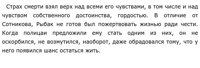 Гордость и сила духа аргументы А. С. Пушкин «Капитанская дочка», В. Быков «Сотник» (Итоговое сочинение (декабрьское))Доказательством того, что в экстремальной жизненной ситуации гордость укрепляет силу духа человека и удерживает его от предательства, лжи и трусости, служит поведение Петра Гринёва главного героя повести А. С. Пушкина «Капитанская дочка — в момент казни защитников Белогорской крепости. Он отказывается присягнуть на верность самозванцу и готов погибнуть на виселице. Поцеловать руку Пугачёва и тем самым признать в нём законного царя — значит предать все жизненные идеалы, унизить себя. Гринёв предпочитает умереть героем, а не жить подлой жизнью предателя. Он не может нарушить присягу, которую давал императрице. От смерти на виселице его спасла лишь случайность. Тесная взаимосвязь гордости и силы духа показана в повести В. Быкова «Сотников». Один из главных героев этого произведения партизан Сотников попадает в плен к немцам. Фашисты допрашивают его и предлагают стать полицаем. Герой стоит перед мучительным нравственным выбором: погибнуть, но не запятнать своей чести или остаться жить, но стать предателем. Будучи человеком гордым и честным, Сотников ни секунды не сомневается в своем решении: он отвергает возможность спасения собственной жизни ценой предательства Родины. Герой мужественно встречает смерть. Ему не приходит в голову мысль унижаться и умолять врага о пощаде. Ведь, по мнению В. Быкова, честь и чувство собственного достоинства превыше страха смерти. Оно укрепляет силу его духа и придает смелости. Вместе с Сотниковым фашистами был захвачен в плен и его боевой товарищ Рыбак. Оказавшись в ситуации нравственного выбора стать полицаем или погибнуть, этот партизан не смог побороть инстинкт самосохранения и струсил. ![]() Герой ступает на путь бесчестия и переходит на сторону врага. Он надевает мундир полицая и по приказу гитлеровцев собственноручно казнит боевого товарища. Таким образом, этот литературный пример показывает: в тяжёлых условиях военного времени каждый человек сам решает, как ему поступить в экстремальной жизненной ситуации, и этот выбор обусловлен его нравственными качествами, прежде всего соображениями чести, гордости и чувства собственного достоинства. Гордость укрепляет человека в выборе поступка, а её отсутствие заставляет идти на нравственные компромиссы и ступать на путь предательства. Обновлено: Опубликовал(а): Дария173 Внимание! Спасибо за внимание. Полезный материал по теме