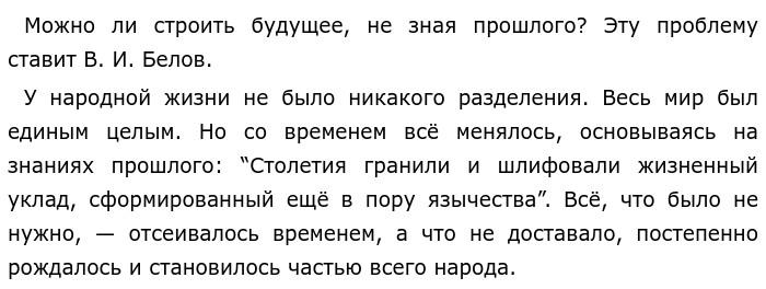 По тексту В. И. Белова «Стихия народной жизни необъятна и ни с чем не соизмерима...» (ЕГЭ по русскому)![]() Главным условием жизни является ритм, на его основе формируется цикличность. Поэтому все взаимосвязано, ничто не может прийти в нашу жизнь вне определенного цикла, то есть из ниоткуда или вне очереди. Благодаря ритму, всё в жизни происходит своевременно. И это правильно, ведь с каждым годом жизнь людей меняется, приходят новые обычаи, мода, технологии. На своих плечах молодежь несёт “социальное развитие общества”. Где бы человек не находился, не работал — всегда необходимы “высокие нравственные начала”, которые строились не только нашими предками, но и целыми поколениями. Пусть с годами появляются новые технологии, но они основываются по тем же правилам, которые были созданы людьми несколько лет или веков назад. Таким образом, молодежи необходимо осознавать всю важность дел, которые отразятся на потомках. Оба эти примера, дополняя друг друга, доказывают, что необходимо помнить прошлое и на основе этих знаний, строить новое будущее. Позиция автора ясна: без опыта людей, которые жили до нас, нельзя идти вперед. Чтобы построить будущее, необходимо основываться на традициях и знаниях прошлых поколений. Благодаря этому богатству человек сможет воспитать в себе нравственные качества и строить будущее, а без знаний прошлого это невозможно. Я полностью согласна с позицией автора. Нравственные качества — это основа жизни поколений. Необходимо воспитывать их в себе. Чтобы идти в будущее, нужно отталкиваться от прошлого, а «движение от ничего или из ничего невозможно». Таким образом, чтобы не совершать ошибки и помогать человечеству развиваться, нужно познавать то, что было до нас. Это необходимо осознавать всем людям и передавать знания новому поколению. Благодаря этому на земле будет мир, любовь и развитие. Обновлено: Опубликовал(а): Ульяна Клычкова Внимание! Спасибо за внимание. Полезный материал по теме