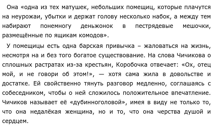 Внешняя деликатность и деловитость помещицы скрывают за собой её жадность, скупость, чрезмерное желание разбогатеть. Коробочка следит за хозяйством и знает всех своих крестьян по именам, однако она всегда будет готова их продать, если от этого появится какая-то выгода. ![]()