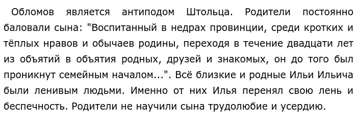 Обловов и Штольц. Сравнительная характеристика (Гончаров И. А.)В своих произведениях авторы используют разные способы характеристики своих персонажей для того, чтобы всесторонне описать их внутренний мир. И. А. Гончаров для этого использовал сон главного героя, в котором подробно описал воспитание, образование и жизнь в родном имении родителей, сформировавшие его личность. Также писатель использует противопоставление двух непохожих действующих лиц. Именно с помощью сопоставления несхожих героев можно ярко и глубоко охарактеризовать их. В романе И. А. Гончарова приём антитезы используется для сравнения Ильи Обломова и Андрея Штольца. Внешнее различие подчеркивает их антагонизм. ![]()