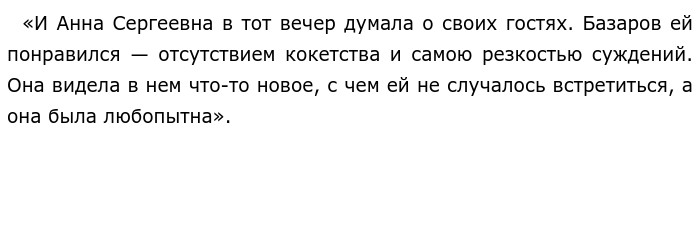 Известие Базарова о том, что он намеревается покинуть её дом и ехать к родителям, куда и собирался изначально, расстроило Одинцову не потому, что она испытывала к нему глубокие чувства, а потому, что он ей определённо нравился и интересовал, и ей не хотелось, чтобы он покидал её дом так быстро. Это подтверждается её поведением после импульсивного признания Базарова в любви — она не отвечает на его чувства, а в ответ на непредсказуемо резкое поведение закономерно пугается его. ![]()