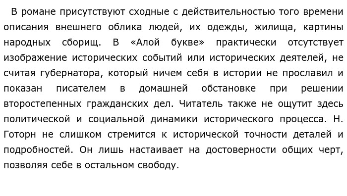 «Алая буква» это роман не об истории, а о прошлом, то есть о Новой Англии прошедших времен, о пуританах, об их правах. Для большей убедительности Готорн вводит и в доказательство в виде клочка алой материи, оказавшийся настоящей алой буквой. Наглядность этой вещи призвана заставить читателя поверить, что его ожидает знакомство с подлинной, а не вымышленной историей. Готорн также был не склонен закрывать глаза на те моменты истории, которые достойны осуждения, и это усиливает объективность автора романтизмом устанавливалась субъективность повествования. Жители города — современники автора кажутся мелкими и пошлыми в сравнении с великими предками, которые были способны на великие дела. Суровый приговор Эстер Прин оправдывается заботой о своих гражданах, а люди сводят счеты с невиновными Готорн считает, что буржуазия живет неправильно и это всеобщая проблема.