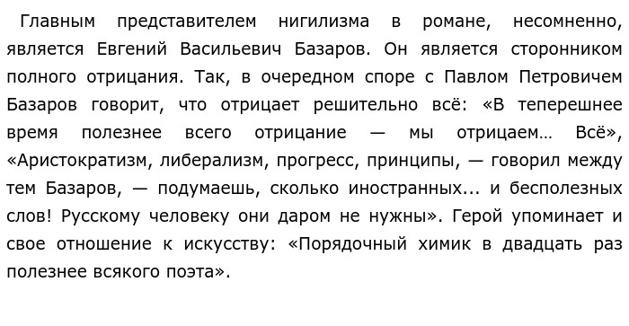 Каково значение слова «нигилист» на языке Аркадия, Евгения Базарова, П. П. Кирсанова, Н. П. Кирсанова, Ситникова? Какой круг явлений связан с нигилизмом в понимании каждого героя? по роману Отцы и дети (Тургенев И. С.)Одной из главных тем романа Ивана Сергеевича Тургенева «Отцы и дети» является нигилизм — модное в то время философское направление. Нигилисты ставят под сомнение общепринятые ценности, обычаи, нормы и идеалы. Однако герои произведения трактуют это понятие не единственным образом, вследствие чего между ними случается множество недопониманий. Давайте же рассмотрим позиции персонажей относительно нигилизма, найдем в них различия и поймем, какой круг событий в представлении героев связан с этим явлением. ![]() Евгений Васильевич не признает авторитетов, ничего не принимает на веру. Герой считает существующие верхние слои общества бесполезными: «Дрянь, аристократишко» и видит задачей нигилизма расчистить место для будущих действий: «Это уже не наше дело... Сперва нужно место расчистить». Во взглядах Базарова явно читается революционный настрой. Мнение, противоположное базаровскому, имеет Павел Петрович. Он видит в нигилизме угрозу для общества. В отличие от Базарова, будучи аристократом, Кирсанов уважает искусство, верит в любовь, ценит красоту природы, придерживается определенных принципов. ![]() Нигилизм для Николая Петровича был причиной разногласий между поколениями. Также в произведении присутствуют ученики Базарова, его последователи, одним из которых является Аркадий Кирсанов. Юноша прежде всего уважает самого Евгения, которого можно назвать кумиром Аркадия. Чем-то и сам нигилизм, конечно, привлекает Кирсанова, однако этим учением он увлекается намного более поверхностно, чем его учитель, Аркадий не задумывается над глубоким смыслом нигилизма. Кирсанов не единственный последователь Базарова, можно также вспомнить Кукшину и Ситникова, которые являются просто тенями Евгения. Нигилизм для них — способ оправдать свои слабости, посчитать себя прогрессивными, хотя выглядят они просто жалкими: «Ситников, тоже готовящийся быть великим, толчется в Петербурге и, по его уверениям, продолжает «дело» Базарова». Таким образом, чуть ли не каждый из героев имеет собственное видение нигилизма и собственные ожидания от него. Для кого-то это смысл жизни, а кто-то, называя себя нигилистом, даже не вникал в суть понятия. Однако, учитывая то, что ни один из называвших себя нигилистом не достиг своих целей, мы не можем сделать вывод о полезности учения. Обновлено: Опубликовал(а): thamgr Внимание! Спасибо за внимание. Полезный материал по теме