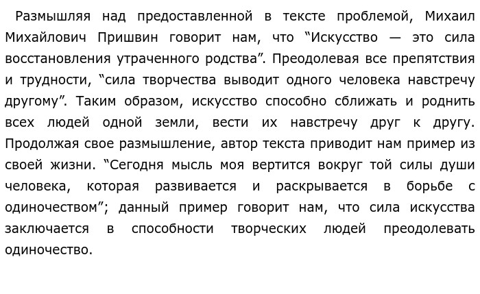 В чём заключается истинная сила искусства? По тексту Михаила Михайловича Пришвина «Учился я плохо и никогда этого себе не прощу: я был очень рассеян и ленив и недостаточно стремился побороть этот свой порок...» (ЕГЭ по русскому)Оценка эксперта внизу В чём заключается истинная сила искусства? Над данной проблемой размышляет автор представленного текста Михаил Михайлович Пришвин. Искусство является неотъемлемой частью жизни каждого человека, оно придаёт жизни человека палитру разнообразных чувств и эмоций. Произведения искусства сохраняют и передают историю и красоту всего, что окружает нас: природы, памятников, людей; и конечно же поднимает вечные вопросы и проблемы. ![]() Эта невероятная сила существует благодаря читателю, к которому обращается писатель в своих произведениях. Оба примера дополняют друг друга, говоря нам о том, что искусство обладает огромной силой, способной объединять и сближать людей. Мнение автора в тексте выражено довольно четко, Михаил Михайлович Пришвин говорит нам, что сила искусства заключается не только в объединении и сближении всех людей одной земли, но и в способности творческих людей преодолевать свое одиночество. Нельзя не согласиться с мнением автора данного произведения. Для подтверждения слов приведу аргумент из собственной жизни. Музыка в наше время является неотъемлемой частью жизни каждого современного человека. Именно общие вкусы в музыке способны выводить человека друг к другу, роднить их, делая друзьями. Также музыка помогает людям преодолевать одиночество, внося в жизнь человека палитру разнообразных чувств и эмоций. Таким образом, данный аргумент ещё раз подтверждает слова автора, что искусство способно сближать и роднить всех людей. Из всего вышесказанного можно сделать вывод, что искусство имеет огромное значение в жизни каждого человека, оно способно породнить всех людей на земле, сила творчества выводит одного человека навстречу другому, а также помогает преодолевать одиночество. Обновлено: Опубликовал(а): 8Александр8 Внимание! Спасибо за внимание. Полезный материал по теме