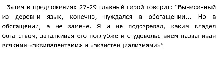 Необходимость сохранения деревенского диалекта по тексту Валентина Григорьевича Распутина «Моё детство прошло в глухой ангарской деревне, в четырёхстах километрах от Иркутска...» (ЕГЭ по русскому)В предложенном для анализа тексте Валентин Григорьевич Распутин размышляет о необходимости сохранения деревенского диалекта. Комментируя данную проблему, обратимся к предложениям 12-14 и 19-20, в которых главный герой выражает свою мнение о речи жителей деревни, в которой он сам жил. ![]() Такое точное и красочное описание дает показывает, какой красотой и каким разнообразием наполнена речь этих людей. Читатель понимает, что рассказчик с большим трепетом и восхищением относится к своему родному языку, он видит в нем невероятную уникальность, поражаясь даже обычными пословицами и поговорками и стремясь передать всю его необычность в своих книгах. Продолжая свои рассуждения, заметим, что после поступления рассказчика в университет, он хотел все больше скрыть свой деревенский диалект, стараясь говорить на городской манер. ![]() Подводя итоги, мы понимаем, что человек не должен стремиться изменять деревенский диалект, поскольку он очень разнообразен и выразителен. На примере рассказчика можно заметить, что родной язык не нуждается в замене, необходимо лишь вовремя обогащать и дополнять его новыми выражениями и словами. Между примерами существует причинно-следственная связь. В первом примере повествуется о любви рассказчика к своему родному языку, из чего и следует его стремление сохранить и беречь свой диалект и свою речь, именно об этом и говорит второй пример. Авторская позиция ясна. Валентин Григорьевич Распутин считает, что пользоваться диалектом нужно действительно разумно, однако его он не должен пропадать под “валом повалившее из «красивых» стран” слов. Его необходимо “принять с великими почестями” и сохранить. Я полностью согласен с мнением автора этого текста. Действительно, важно стремиться оберегать все возможные диалекты, так как они является частью истории развития нашей современной речи, поэтому и частью развития нашего государства. По-моему мнению, сохранение истории нашей страны является очень важной целью. Хотелось бы верить, что читатели задумаются о проблеме, поставленной в тексте, и больше не будут стесняться своей родной речи, а наоборот покажут её всем только с самой хорошей стороны. Обновлено: Опубликовал(а): 8Александр8 Внимание! Спасибо за внимание. Полезный материал по теме
