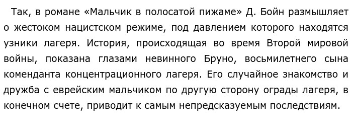 Почему важно помнить о жертвах фашизма? Борьба с фашизмом была, может быть, первой в истории человечества всемирной заботой (ЕГЭ по русскому)Даниил Александрович Гранин, советский и российский писатель, киносценарист, общественный деятель, рассуждает о важности истории в жизни современного общества. Почему важно помнить о жертвах фашизма? Именно эта проблема находится в центре внимания автора. Размышляя над этим вопросом, Д. А. Гранин, чтобы показать значимость воспоминаний о людях, пострадавших от насилия, обращается к собственному опыту. Автор вспоминает поездку на экскурсию в Бухенвальд – бывший лагерь смерти, «где фашисты уничтожали людей». Д. А. Гринин отмечает выступление писателя Бруно Апитца, который был узником этого места. Он « не хотел плакать, он готовился сказать какие-то очень важные слова», но, поднявшись на ступени памятника, не выдержал и все-таки дал волю эмоциям. Приведённый фрагмент даёт понять, что люди, испытавшие на себе ужас «лагерей смерти», прошедшие через надругательства фашистов, не смогут забыть эти события. Они никогда спокойно не посмотрят на памятник, так как в голове у них будут всплывать мучения, через которые им пришлось пройти. В подтверждение этого, чтобы показать, что люди со всего мира помнят о жертвах фашизма, автор обращает особое внимание на то, что сквозь года жители разных стран приезжают в памятные места, чтобы проявить уважение пострадавшим и погибшим от рук нацистов. Бухенвальд посещают и представители младшего поколения : «…ходили экскурсанты, было много школьников. » Этот эпизод показывает важность сохранения памяти о событиях тех лет, указывая на то, что они являются значимыми для представителей разных стран, культур, поколений. Оба примера неразрывно связаны друг с другом, потому что содержат ответы на вопрос о том, почему важно помнить о жертвах фашизма. Автор считает, что память о событиях того времени нужно хранить, чтобы отдать дань уважения участникам войны, чтобы младшее поколение знало, что пришлось пережить защитникам нашей страны и гордилось ими. Я полностью согласна с мнением Д. А. Гранина. Действительно, важно знать о том, что пришлось преодолеть людям в годы войны, какие страшные испытания они смогли выдержать. Для подтверждения своей позиции обращусь к личному читательскому опыту. ![]() Мальчик догадывается об ужасной судьбе Шмуэля. Между ними быстро завязываются дружеские отношения. В конечном итоге, оба погибают от рук фашистов. Таким образом, нацистский режим отнимает жизни двух ни в чем не виновных детей. В заключение хочется отметить, что проблема фашизма является актуальной во все времена. Необходимо уважать людей, подвергшихся надругательству со стороны нацистов, помнить об их неоспоримом героизме и мужестве. Обновлено: Опубликовал(а): missjanekis Внимание! Спасибо за внимание. Полезный материал по теме