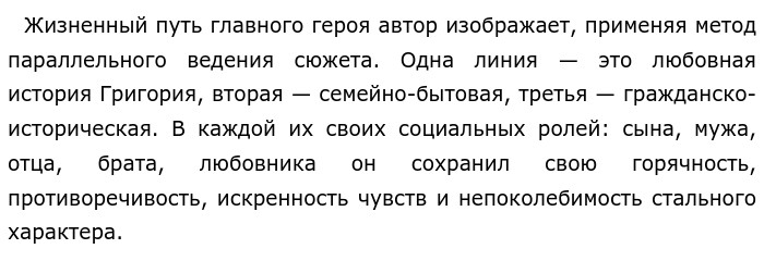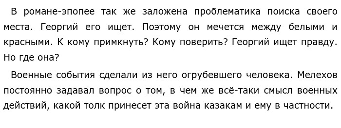 Георгий любит природу, относится к ней с трепетом и любовью. Тому подтверждение сцена с несчастным утёнком, которому досталось от железной помощницы любого крестьянина — косы. Главный герой испытывает жалость к этому милому созданию, которое ещё даже пожить не успело. Мы видим честного, чистого и искреннего юношу. Но, увы, таким мы будем наблюдать Георгия лишь в самом начале романа. А потом… Юноша жил в непростое для России время. Гражданские войны, первая мировая война. А он лишь молодой человек, который не совсем определился в жизни. И вот наш несчастный Георгий начинает свой трудный жизненный путь. За плечами Григория первая мировая война, гражданская война и революция. Это тяжелые события. Как он смог это всё пережить? Юноша, который ещё вчера с такой жалостью смотрит на убитого утёнка, сегодня рассекает шашкой голову врагу. Это так страшно. И, конечно, всё это не прошло бесследно для героя. Это повлияло на его мировоззрение, несомненно. А плюсом к этому ещё и метания в личной жизни. Этот герой постоянно мечется. И это связано не только с гражданской темой, но и с темой любовной. ![]()