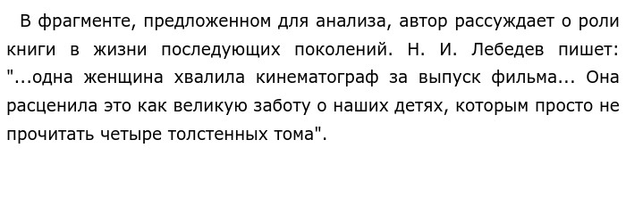 Нужно ли знакомить детей и подростков будущего с шедеврами классической литературы? По тексту Н. И. Лебедева «Владимир Солоухин в одном из стихотворений высказывает мысль, что того, кто несёт в руках цветы, можно не опасаться, ибо человек с цветами…» (ЕГЭ по русскому)Оценка эксперта внизу Нужно ли знакомить детей и подростков будущего с шедеврами классической литературы, если её стремительно вытесняют другие виды искусства? Эту проблему ставит сценарист Н. И. Лебедев в тексте. ![]() Тем самым автор хочет сказать, что произведения классиков далеко не всеми воспринимаются как обязательные к прочтению для молодёжи. С другой стороны, автор включает в текст высказывание философа Дидро: "Кто мало читает, тот перестаёт мыслить". Тем самым Н. И. Лебедев подчёркивает значимость литературы для воспитания личности. Эти примеры противопоставлены друг другу. Таким образом, можно сказать, что они включены в текст, чтобы подчеркнуть: по мнению Н. И. Лебедева, не стоит соглашаться с точкой зрения, согласно которой без художественных книг можно обойтись. Позиция автора заключается в поддержке людей, стремящихся сохранить доступность шедевров классики для молодёжи, осознающих, что кино, телевидение ни при каких условиях не могут их заменить. Я разделяю точку зрения Н. И. Лебедева по этой проблеме. Дело в том, что для понимания фильма действительно не нужно самостоятельно представлять, как выглядят герои, где они находятся. Умственных усилий просмотр кинокартины не требует, это означает, что воспитать человека исключительно с помощью шедевров кинематографа невозможно. То же самое можно сказать и о телепередачах. Знакомством с точкой зрения ведущих нельзя заменить прочтение книги, поскольку викторины и обзоры русской классики достаточно непродолжительны, а за короткое время невозможно получить полное представление о произведении. Итак, искренне надеюсь, что внуки и правнуки не будут лишены ценнейшей возможности прочесть «Войну и мир» Л. Н. Толстого и «Капитанскую дочку» А. С. Пушкина. Верю: замены книг на фильмы не произойдёт ни при каких обстоятельствах. Обновлено: Опубликовал(а): Ekspert Внимание! Спасибо за внимание. Полезный материал по теме