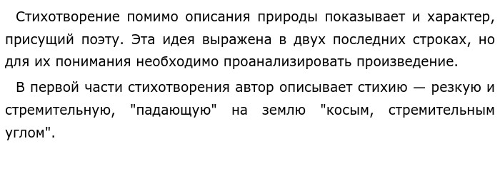 10. Как две последние строки «Грозы» П. Д. Когана содержательно соотносятся с основным текстом стихотворения? 11. Назовите произведение поэта, в котором показана природная стихия. В чём оно сходно (или различно) с «Грозой»? (ЕГЭ по литературе)10. ![]() Автор подразумевает, что и в людях бывает подобная гроза: это внутренняя сила, страсть и даже дерзость. Люди, подобные грозе, не останавливаются ни перед чем, являются яркими личностями и добиваются успехов в жизни, однако часто быстро уходят из мира — как и бушевание стихии в стихотворении, которое "задохнулось". Антитезой к этому служит вторая часть произведения, где описан спокойный, но скучный покой: "устало высохла трава". Для поэта такой вариант не подходит: он сравнивает мир с равнодушием, с овалом, не имеющим резких углов и перегибов. Спокойствие может длиться дольше, но слишком осторожные и тихие люди чаще всего проживают обычную серую жизнь, не свершив ничего великого или необычайного. Именно поэтому Коган пишет в конце о своем мнении: "Я с детства не любил овал! Я с детства угол рисовал!". Таким образом, автор предпочитает яркую и страстную натуру тихой, но равнодушной. Для него реальные эмоции и сила духа важнее безопасности или долгой жизни, он готов приложить все усилия, чтобы прожить свою жизнь не напрасно.