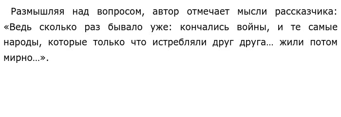 Проблема войны по тексту Г. Я. Бакланова «Весь в пару, надвинулся к перрону поезд…» (ЕГЭ по русскому)Нужны ли войны ценой человеческих жизней? Именно этой проблеме посвящен текст русского писателя Григория Яковлевича Бакланова. ![]() Этот пример показывает, что метод решения конфликтов боевыми действиями бессмысленный, поскольку следом за тяжелым временем потерь люди возвращаются к истокам — мирному сосуществованию. Далее Г. Я. Бакланов обращает внимание на цену человеческой жизни в свете войны: «…ведь не для того живёт человек на свете, чтобы удобрить собою землю». Эта метафора подчеркивает, что целью жизни погибших не была смерть на поле боя. Их судьба могла сложиться по-другому, однако все предрешило столкновение, в котором люди вынуждены убивать друг друга. Таким образом, оба эти примера, дополняя друг друга, помогают понять, что войны бессмысленны и жестоки, ведь они обесценивают человеческую жизнь. Позиция автора текста довольно ясна. Вооруженные конфликты влекут за собой множество людских потерь, что говорит о несостоятельности метода решения проблемы. Не могу не согласиться с мнением Г. Я. Бакланова. Жизнь — самое дорогое, что есть у человека, и он не должен её лишаться на поле боя. Так, в романе-эпопее Л. Н. Толстова «Война и мир» Петя Ростов, будучи ещё совсем молодым, отправился на фронт. В ходе военной операции он был ранен в голову, от чего скончался на месте. Война и к нему оказалась беспощадна: его жизнь оборвалась на шестнадцатом году, когда прожито совсем мало и есть большие надежды на будущее. Это доказывает, что борьба между людьми, ведущая к смерти, не имеет смысла, потому что человек живет совсем не для этого. Таким образом, война, оставляющая после себя несчитанное количество погибших, не имеет смысла, ведь ничто не может оправдать отнятые жизни. Обновлено: Опубликовал(а): maximax Внимание! Спасибо за внимание. Полезный материал по теме