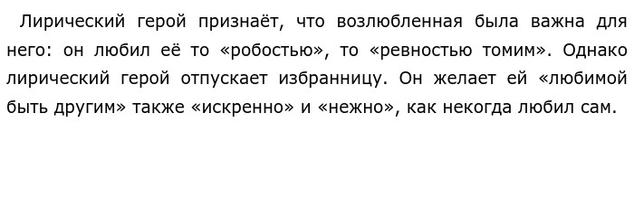 Во-вторых, в обоих стихотворениях звучит благодарность за любовь. Так, в произведении А. Белого лирический герой отпускает избранницу полный «щемящей грусти». Однако его чувства — это светлая печаль, он не корит возлюбленную, о чём говорит эпитет «нежных…волн», средь которых «мелькал» корабль. Лирический герой благодарен девушке за любовь. Об этом говорит наступившая «вдруг» заря, символизирующая все светлые чувства, которые принесли эти отношения: на небе взошло облако, запылавшее «ярким аметистом». И в стихотворении А. С. Пушкина звучит подобный мотив. Лирический герой признаётся в том, что любил избранницу «безмолвно, безнадежно», то есть не требуя взаимных чувств от неё. Он не обвиняет возлюбленную и не ждёт ответа. Лирическому герою было важно это чувство и он желает ей лишь «любимой быть другим». Таким образом, в стихотворениях А. С. Пушкина и А. Белого звучит тема любви. В обоих произведениях лирический герой отпускает избранницу и благодарен ей за это чувство. Обновлено: Опубликовал(а): Ekspert Внимание! Спасибо за внимание. Полезный материал по теме