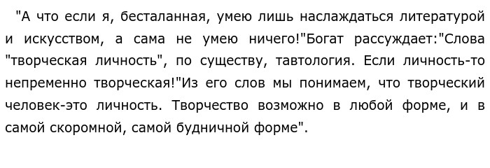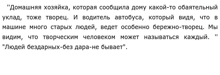 Кого можно назвать творческим человеком? Что такое творчество? Что такое творческий человек? А это вопрос человеческой судьбы (ЕГЭ по русскому)Кого можно назвать творческим человеком?Автор в данном тексте предлагает задуматься над этой проблемой. На мой взгляд, творчество-это яркий талант, который дан каждому В качестве примера писатель приводит письмо чертежницы. Женщина задается вопросом: ![]()