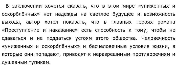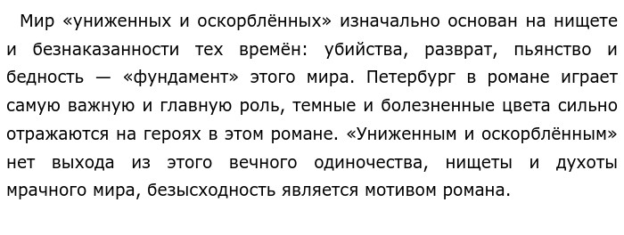 Изображение мира «униженных и оскорблённых» в романе «Преступление и наказание» (Достоевский Ф. М.)Роман «Преступление и наказание» является одним из самых выдающихся романов Ф. М. Достоевского, в котором ярко показана жизнь и быт народа Петербурга в 60-х годах 19 века. Вот как писал об этом романе Д. С. Мережковский: «Преступление и наказание» — один из самых серьёзных, глубоких и оригинальных романов Достоевского». Из этого высказывания можно понять то, что всех критиков, писателей и простых людей очень поразила глубина и детальность персонажей, обстановки, в том числе и сам роман «Преступление и наказание». Только Достоевский мог так передать все переживания, терзания и борьбу внутри главного героя — Раскольникова, а также множество других героев, которые не остались без внимания читателей — Соня, Мармеладов, Дуня, Лужин, Свидригайлов, все они описаны с наибольшей точностью Фёдором Михайловичем Достоевским. ![]()