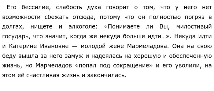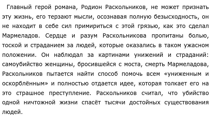 В первую очередь, сцена знакомства Мармеладова и Раскольникова в трактире — начало повествования темы «униженных и оскорблённых». Монолог Мармеладова, похожий на исповедь, отражает всю сущность маленького человека, и того, кто отречен от общества. ![]() Ей было невыносимо жить в такой обстановке: грязь, пьянство, голод. Это не свойственно для Катерины Ивановны, ведь она честолюбивая натура и хорошего происхождения. Она не смогла выжить в этом обществе и скончалась, как и Мармеладов. Эти эпизоды говорят о том, что муж и жена не смогли выбраться отсюда, им некуда было деваться. Дочь Мармеладова Соня — чистая, невинная и верующая девушка, при этом вынуждена идти «по желтому билету». Ей пришлось продавать свое тело лишь потому, что в их семье даже не было еды, что уже говорить об чистой одежде и любых других нужд обычных людей. ![]()