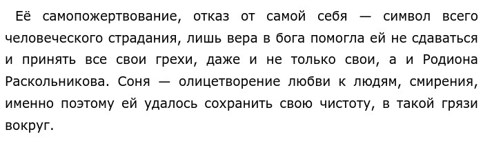 Дуня — сестра Родиона Раскольникова, еще один яркий пример самопожертвования. Она невинная, любящая, и готова на все ради своего брата. Авдотья согласилась на брак с Лужиным, который был намерен издеваться над ней, ставить ее ниже себя, чтобы на фоне такой образованной и не глупой девушки казаться умнее и лучше. Эти издевки были именно не физические, а моральные. Дуня была готова на этот брак, но отказалась, как только увидела в Лужине эту «гниль». Это говорит о том, что образ Дуни чем-то похож на Соню, они обе жертвуют ради своих близких людей. Положение «униженных и оскорблённых» оставляет желать лучшего, потому что у них нет выбора этой жизни, им приходится жить в этой бедности и нищете, с которой сложно справиться и не сдаться. Их положение толкает на преступление против самих себя, ставит их перед выбором путей, которые по-разному ведут к «сделкам» с совестью. ![]() Этот поступок привел Раскольникова к страшным мукам, которые терзали его голову, лишь Соня Мармеладова смогла помочь Раскольникову искупить свою вину. Теория Раскольникова — это совсем не глупая вещь, а вполне достойная внимания других людей, стараясь помочь остальным он сам погряз в этих мыслях об своем убийстве, несмотря на то. Что ему было не жаль старуху-процентщицу, он беспокоился об совсем неповинной Лизавете, чью жизнь он тоже оборвал. Соня была единственной, кому тот смог довериться и выйти из этого общества, так и не примирившись с ним. Это говорит о том, что перед Раскольниковым стояло много путей его жизни и лишь Соня смогла подтолкнуть его на верный путь. ![]() Обновлено: Опубликовал(а): Nastyha Ilina Внимание! Спасибо за внимание. Полезный материал по теме