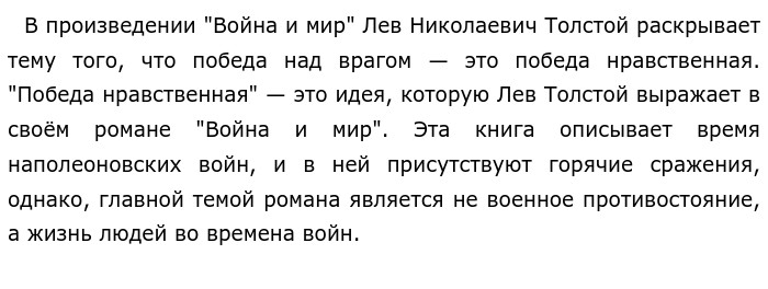 Как Вы понимаете мысль автора романа-эпопеи «Война и мир» о том, что главная победа над врагом — это «победа нравственная»? (Толстой Лев Н.)![]()