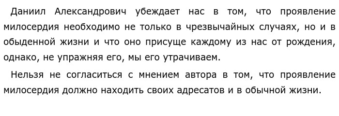 Милосердие по тексту Д. А. Гранина «В прошлом году со мной приключилась беда…» (ЕГЭ по русскому)Оценка эксперта внизу Обратимся к тексту советского и русского писателя Даниила Александровича Гранина. В центре внимания автора-проблема утраты милосердия. Рассуждая о данной проблеме, автор делится с нами своим жизненным опытом. Рассказчик описывает своё падение, произошедшее в прошлом году. Поскользнувшись, он сильно ушибся: сломал переносицу, разбил лицо, рука выскочила в плече. И, идя с таким видом по многолюдным местам, он заметил, что никто из прохожих не подошел к нему и не спросил, что случилось. Люди наоборот сначала рассматривали его с любопытством, а потом отворачивались. Этот пример показывает, что стремление не ввязываться в чужие проблемы, не тратить на это своё время и силы-становится обычным явлением. В качестве второго аргумента автор приводит следующее: главные жизненные правила фронтовой поры. В то время исключено было, чтобы кто-то прошел мимо раненного, отвернувшись или сделав вид, что не замечает его. После войны долго ещё оставалось среди людей чувство взаимопомощи, однако со временем оно исчезло. Этот пример показывает, что люди умеют проявлять милосердие, однако находясь в чрезвычайных ситуациях или ещё не до конца забыв о них. Оба примера, противопоставляя друг другу, показывают отношение людей к чужим болям и проблемам. Позиция автора ясна. ![]() Ведь реалии нашей жизни довольно жестоки, поэтому малейшая помощь, даже просто сострадание играют значительную роль для человека. Именно твое неравнодушие к проблеме другого может спасти ему жизнь. Хочется верить, что читатели задумаются над проблемой, поднятой в тексте Д. А. Гранина. Обновлено: Опубликовал(а): Ekspert Внимание! Спасибо за внимание. Полезный материал по теме