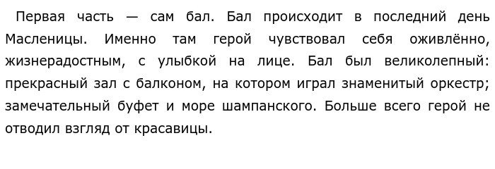 Контрастное изображение в рассказе «После бала» (Толстой Лев Н.)Рассказ Л. Н. Толстого "После бала" имеет глубокий смысл. Произведение довольно небольшое, но с какой мыслью. Рассказ делится на две части: первая часть — сам бал, вторая часть — после бала. Вторая часть полностью противопоставляется первой части. Для начала нужно сделать анализ рассказа и узнать что такое контраст? Контраст — это важный художественный приём, который основан на резком противопоставлении друг другу. Как в начале я уже сказала, что две части противопоставляются друг другу и я приведу несколько аргументов, чтобы доказать что контраст в этом произведении есть и почему она контрастное произведение. ![]() Красавица была одета в белое платье, розовый пояс, лайковые перчатки, звали её Варенька. Очаровательный момент во время бала — это сцена танца Вари с её отцом, наш герой умилялся с их чудесного танца. Именно этот момент заставил думать хорошего мнения об отце Вари. Но на следующее утро все изменилось. Вторая часть — после бала. Побывав с утра на улице, герой нашего рассказа узнал много об отце Вари. Отец Вари был полковником. На улице он слышит нехорошую музыку и видит много черных людей, которые толпятся по середины улицы. Среди этих людей он замечает знакомое лицо — это был полковник. Герой увидел, как отец безжалостно бьёт человека прутьями. Как я уже сказала, люди были одеты в черный костюмы, а на балу были яркие. Также на балу была веселая, радостная музыка, а после бала он слышит нехорошую душераздирающую музыку. После этого персонаж увидел настоящее лицо полковника. Также он заметил, как жизнь различается на балу и после. С такими аргументами, мы пришли к выводу, что это контрастное произведение, и насколько сильно отличается жизнь людей в разное время. Этот рассказ нас учит— не судить человека по обложке. Не зря говорят: "Встречают по одежке, провожают по уму". Обновлено: Опубликовал(а): Карина Васильева Внимание! Спасибо за внимание.