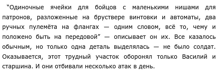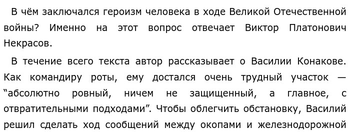 Таким образом, Виктор Платонович Некрасов показывает то, насколько люди, не жалея себя, боролись за Родину. Всего пары человек становилось достаточно даже для очень сложного участка.