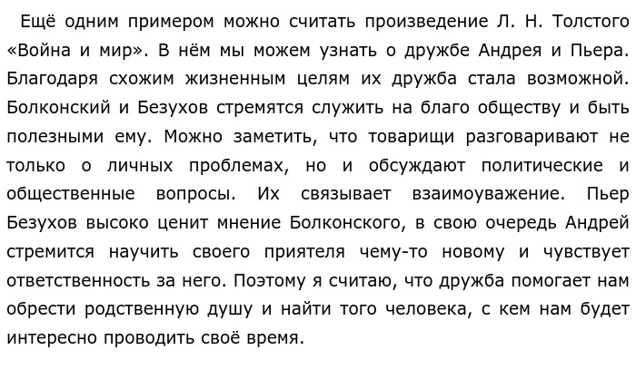 Какую роль играет дружба в жизни человека? Аргументы И. А. Гончаров «Обломов», Л. Н. Толстой «Война и мир» (Итоговое сочинение (декабрьское))Друзья — это те люди, которые по-настоящему близки нам, с кем нам интересно, а самое главное, на кого мы можем положиться. На протяжении всей жизни человек знакомится с огромным количеством людей, но лишь некоторых он может назвать своими друзьями. Но какую именно роль играет дружба в жизни человека? Я считаю, что каждый решает сам. Для кого-то это потребность в общении и в поддержке, для кого-то способ познания мира и самого себя, а кто-то ищет в товарищах родственную душу и делит с ним все переживания. Сейчас я попробую привести аргументы из литературы. В произведении И. А. Гончарова «Обломов» мы можем увидеть пример настоящей дружбы. Главный герой романа Илья Ильич Обломов является «русским ленивцем». Он привык к безделью, ведь его с детства приучили к тому, что за него будут делать всю работу. Обломов нуждается в заботе так как совершенно ничего не понимает в практических делах и зачастую становится жертвой обмана. С этим ему помогает друг детства — Андрей Штольц. Он показан как противоположность своего товарища Обломова. Андрей очень ценит и любит своего друга, поэтому пытается помочь Илье преодолеть свою лень. Штольц вынуждает Обломова выйти из своего дома в свет. Также Андрей понимает, что дружба Ильи Ильича искренна, ведь он знал Штольца ещё до того, как у него появились богатства. Даже после смерти друга, Андрей берёт сына Обломова к себе на воспитание. Таким образом, я считаю, что этот пример отлично показывает, что, не смотря на несхожесть характеров героев, дружба продолжается и остается важной в жизни героев и помогает им справляться с трудными жизненными ситуациями. ![]()
