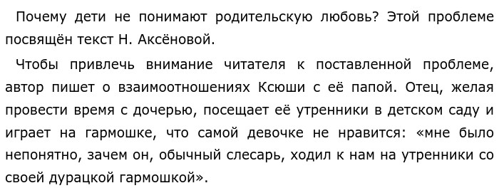 Непонимание родительской любви по тексту Н. Аксёновой «В детстве я ненавидела утренники, потому что к нам в садик приходил отец…» (ЕГЭ по русскому)Оценка эксперта внизу ![]() Ксюше кажется глупым поведение отца, и поэтому она ведёт себя с ним «подчеркнуто холодно». Стоит отметить, что сама игра на гармошке девочку не раздражает, ведь далее она говорит: «Играл бы себе дома и не позорил ни себя, ни свою дочь!». Видя, как окружающие дети относятся к её родителю, Ксюша и сама переняла подобное отношение, прежде всего потому, что ей стыдно за него перед другими детьми. Так писатель доносит следующую мысль до читателя: социализация играет важную роль в жизни человека, а маленькие дети чаще всего хотят поскорее вырасти, так как им "претит" родительская опека, выставленная на всеобщее обозрение. Оба примера из текста, дополняя друг друга, объясняют важную мысль автора: дети не воспринимают родительской заботы вследствие влияния на их восприятие негативно настроенного окружения, однако, вырастая и становясь родителями, «бывшие дети» осознают всю силу родительской любви. Писатель не выражает свою позицию прямо, однако плавно подводит читателя к мысли, что не нужно стесняться проявления родительской любви. Я полностью разделяю позицию автора и считаю, что надо любить и уважать своих родителей вопреки тому, как к ним относятся окружающие, ведь родители и сами в нас души не чают. Герой произведения «Отцы и дети» И. С. Тургенева, Евгений Базаров, будучи представителем нигилистов, придерживается крайне радикальных взглядов, в числе которых и отсутствие всяких чувств. Раз за разом приезжая домой, он старается держаться с родителями холодно, однако в глубине души всё-таки рад проявлению родительской любви. Таким образом, мы пришли к выводу, что дети должны любить своих мам и пап такими, какие они есть, ведь родителей не выбирают. Обновлено: Опубликовал(а): Ekspert Внимание! Спасибо за внимание. Полезный материал по теме
