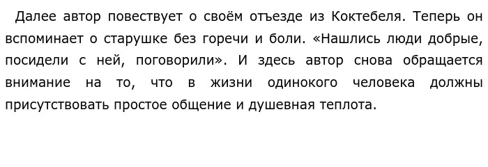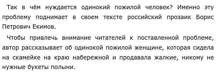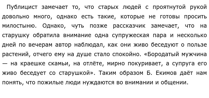 В чём нуждается одинокий пожилой человек? По тексту Б. П. Екимова «В Москве осень, а в Коктебеле бархатный сезон…» (ЕГЭ по русскому)Оценка эксперта внизу В нашем мире одиночество не является редкостью, и многие люди, особенно пожилые, чувствуют себя никому не нужными. Молодое поколение считает, что им уже ничего не требуется, поэтому некоторые старики даже остаются без внимания и поддержки своих детей, и им приходится доживать свою жизнь наедине с собой. ![]() И хоть к ней практически никто не подходил, уставшая она все приходила на одно и то же место, пытаясь хоть немного заработать себе на жизнь. ![]()