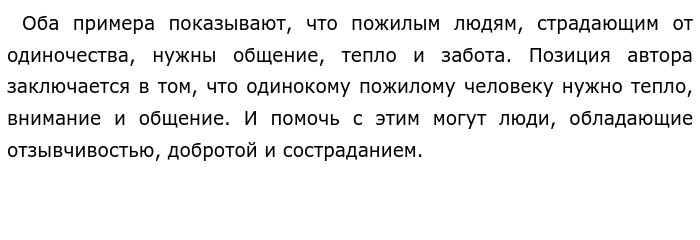 Я согласна с мнением автора и тоже считаю, что нужно с заботой относиться к старым людям и не отворачиваться от них. Они также, как и другие люди нуждаются во внимании и помощи. Даже короткий разговор с ними может вызвать у них улыбку и чуство того, что о них помнят и что в мире есть люди, которым они нужны. Но увы не все получают ту поддержку и помощь, которая порой требуется старикам и в этом меня убеждает художественная литература. В произведении К. Г. Паустовского "Телеграмма" старая женщина по имени Катерина Петровна доживала свои дни в одиночестве. Каждый день она думала о своей дочери, что уже три года не навещала мать, и от этого ей было тяжко. После одного случая Катерина Петровна написала письмо Насте о том, что она не переживёт зиму, но девушка отложила это письмо на потом. И только через некоторое время, когда ей принесли телеграмму с новостью о тяжёлом состоянии матери, она наконец прочитала письмо и поняла, что никто её не любил так сильно, как Катерина Петровна. Но увы девушка опоздала и не смогла увидиться с ещё живой матерью. Теперь её терзало чувство вины перед ней. Таким образом можно сделать вывод, что пожилому человеку нужно внимание, поддержка, тепло и забота, и тогда он не будет чувствовать себя одиноким. А самое главное то, что это должно быть искренне, от всего сердца и не должно откладываться на потом, пока еще не поздно. Обновлено: Опубликовал(а): Ekspert Внимание! Спасибо за внимание. Полезный материал по теме