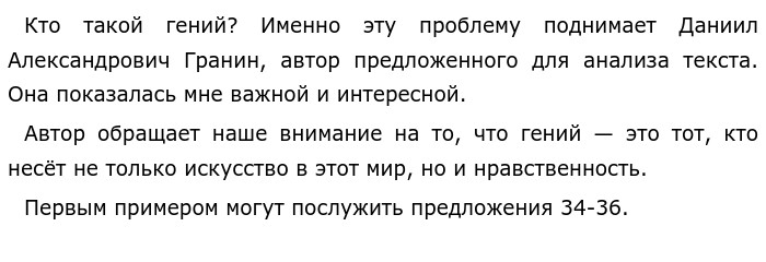 Кто такой гений? По тексту Д. А. Гранина «С годами меня всё чаще тянет к пушкинским стихам, к пушкинской прозе…» (ЕГЭ по русскому)Оценка эксперта внизу ![]() В них повествуется, что для Пушкина гений это тот, кто может сохранить душевную чистоту, «творческую крылатость». По мнению Александра Сергеевича, гений не только проявляется в таланте, и в духовном наполнении писателя. Гений — это очень духовно богатый человек, чистый в своих помыслах, который готов нести в этот мир только добро. Для дополнения обратимся к другому примеру. В приложениях 40-79 рассказывается о том, что у Пушкина Моцарт — это в первую очередь личность, которая обладает огромным количеством прекрасных человеческих качеств. Талантливый человек духовно чист и прекрасен. Существует тонкая грань, отличающая простого обывателя от гения. Это то, любой талант ничего без нравственной наполненности гения. Сопоставив аргументы и комментарии к ним, я пришла к выводу: примеры дополняют друг друга и позволяют понять, что гений — это не только талантливый, но и духовно богатый человек. Позиция автора мне предельно ясна: он считает, что гению мало одного таланта, он должен быть также духовно богат. Гений не завидует, он всегда открыт, добр, великодушен. Ему чужда грязь этого мира, его пороки и жестокости. Я полностью согласна с мнением автора и тоже считаю, что только сочетание таланта и духовной просвещенности сможет сделать из человека гения. Настоящее искусство, на мой взгляд, оно неземное, выше простого бытия. Человек, который создает великие произведения не может быть грешен и поглощён людскими пороками, он выше всего этого. Гений умеет видеть последствия, быть пророком, но не возвышаться над людьми, а наоборот, служить им и создавать своё творчество во благо человечества. Таким образом, исходу из изложенного выше, можно сделать вывод: гениальность — это симбиоз таланта и нравственный качеств человека. Только так у гения получится создать великие произведения на века. Проблема, обозначенная автором, будет актуальна во все времена. Обновлено: Опубликовал(а): Ekspert Внимание! Спасибо за внимание. Полезный материал по теме