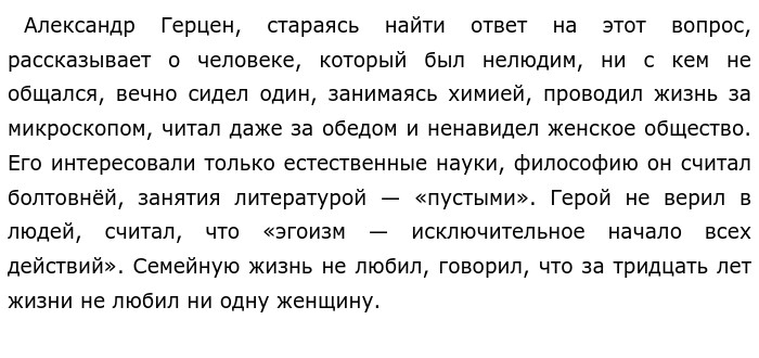 | Могут ли люди с нигилистическими взглядами испытывать тёплые чувства? По А. И. Герцену «Об этом человеке носились странные слухи: говорили, что он был нелюдим, ни с кем не знался, вечно сидел один, занимаясь химией…» 21 вариант Сборник Цыбулько ЕГЭ-2023 (ЕГЭ по русскому)Нигилизм — это отрицание общепринятых ценностей, негативное отношение к определённым сторонам жизни. Нигилистам трудно найти общий язык с окружающими, так как их взгляды сильно различаются. Отрицание любви, искусства, духовных ценностей зачастую отталкивает от нигилистов. Могут ли люди с нигилистическими взглядами испытывать тёплые чувства?  Итак, люди с нигилистическими взглядами чаще всего нелюдимы и одиноки, они не верят в людей. При этом в тексте говорится о том, что в Химике, в таком “холодном” человеке, всё же оставалось тепло — любовь к старушке матери. Они много страдали вместе от отца, “бедствия” сплотили их. Герой окружал вниманием одинокую старость женщины. Таким образом, мы видим, что даже нигилисты могут любить и дарить тепло родному человеку. Приведённые противопоставленные друг другу примеры-иллюстрации позволяют нам говорить о том, что люди с нигилистическими взглядами так же, как и все, испытывают тёплые чувства к близким. Позиция автора ясна. А. И. Герцен уверен, что даже человек со «строгим воспитанием мысли фактами» обладает душевным теплом. Нельзя не согласиться с мнением писателя. Я считаю, что каждый способен дарить любовь и заботу. И даже человек, скептически смотрящий на душевные чувства, не может не испытывать сострадания, нежности, любви к близким. Немало примеров этому в литературе. Главный герой романа И. С. Тургенева "Отцы и дети" Базаров — нигилист. Он отрицает духовные ценности, не признаёт искусство, не верит в любовь. Однако он всё же испытывает нежные чувства к своим родителям, хоть и не показывает этого. Итак, мы можем говорить о том, что даже нигилист может любить и ценить близких. Подводя итог вышесказанному, хотелось бы отметить, что каждый человек способен испытывать добрые чувства к другим, и нигилисты не являются исключением. Обновлено:   Опубликовал(а):  bina.mart Внимание! Спасибо за внимание. Полезный материал по теме
