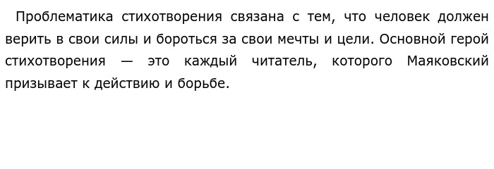Анализ стихотворения «А вы могли бы?» от Андрея Деревецкого (Маяковский В. В.)"А вы могли бы?" — стихотворение Владимира Маяковского, написанное в 1926 году. Маяковский — советский поэт, прозаик, драматург, художник и активист, родившийся в 1893 году в Грузии и умерший в 1930 году в Москве. Он является одним из самых известных и важных представителей русской поэзии XX века. Название стихотворения "А вы могли бы?" задаёт вопрос читателю, вызывая его на размышление о своих способностях и возможностях. В стихотворении Маяковский обращается к читателю, призывая его к действию и вызывая на борьбу с трудностями жизни. Тематика стихотворения связана с проблемой человеческого достоинства и возможностей. Основная мысль стихотворения заключается в том, что каждый человек может достичь высот, если он верит в себя и не боится бороться с трудностями. ![]()