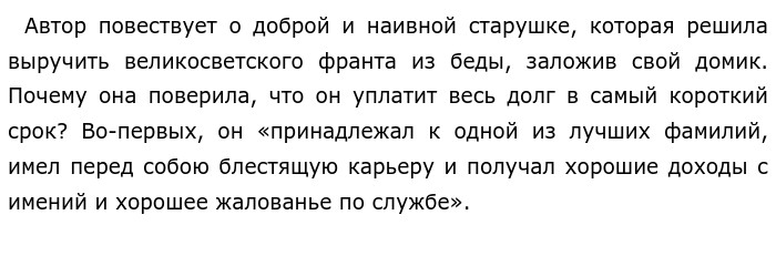 Проблема помощи людям по тексту Н. С. Лескова «Несколько лет назад в Петербург приехала маленькая старушка-помещица, у которой было, по её словам, «вопиющее дело» (ЕГЭ по русскому)Всегда ли стоит помогать людям? Над этим вопросом заставляет задуматься Н. С. Лесков. ![]() Во-вторых, старушка когда-то знала мать этого господина и по старой дружбе с ней решила помочь. Как оказалось, этого оказалось мало для того, чтобы он выплатил обязательство. Это говорит о том, что не всегда высокий статус в обществе и благополучное финансовое положение позволяют оценивать человека с положительной точки зрения. При всё при этом он может быть бесчестным, бессовестным лгуном, который не заслуживает помощи. Старушка со всей душой желала помочь франту выйти из затруднительного положения. Но в ответ получила не благодарность за спасение, а лишилась заложенного дома. ![]() На её добро ответили жестоким злом. Мучительная комедия заканчивается тем, что франт собирается уезжать за границу надолго, а может быть, навсегда, в то время как домик старушки выставляют в канун Рождества на продажу. Этот человек совершенно не заслуживал той чистоты и искренности души, с которой отнеслась к нему старая женщина, наивно поверившая в его высокие моральные качества. Два примера доказывают то, что не всегда люди отвечают за свои слова, поступают добросовестно, заслуживают проявляемую к ним доброту. Авторская позиция ясна: в мире всегда есть лживые люди, готовые ради собственной выгоды и обмануть, и предать, и чрезмерно воспользоваться своим положением. Очень важно не попасться на такого человека, чтобы не потерять что-то очень ценное в своей жизни. Я согласна с позицией автора. Порой люди, которые приносят добро, не замечают того, что ими нагло пользуются, хотят лишь обогатиться за счёт их душевной простоты и наивности. Так, в рассказе А. И. Солженицына «Матрёнин двор» главная героиня всегда бескорыстно всем помогала, но никто не пытался заботиться о ней в ответ. После смерти Матрены лишь Кира действительно переживала за неё, а не за утраченное зря имущество. Таким образом, не каждый человек достоин доброты, которую к нему проявляют. Люди должны относиться друг к другу с таким же уважением, которого заслуживают и для себя. Обновлено: Опубликовал(а): Ксюша Михеева Внимание! Спасибо за внимание. Полезный материал по теме