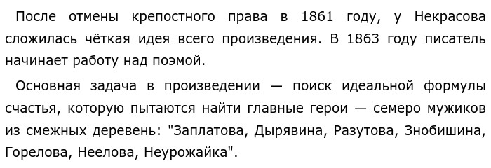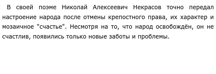 Народ освобождён, но счастлив ли народ? Поиск идеальной формулы счастья героев по поэме Кому на Руси жить хорошо (Некрасов Н. А.)История создания поэмы "Кому на Руси жить хорошо" начинается ещё в 1850-х годах, когда у Николая Алексеевича Некрасова рождается идея и он начинает собирать информацию. Также "Записки охотника" Ивана Сергеевича Тургенева стали одним из множества источников образов его героев. ![]() Путешествуя по деревням, они узнают истории "счастья" разных людей и пытаются выяснить, кому же на самом деле "живется весело, вольготно на Руси". Поговорив, главные герои выстроили возможную цепочку, кто должен жить хорошо: поп, помещик, чиновник, купец, вельможа, министр и царь. Первый на пути странников встретился поп, который считал истинное счастье в "покое, богатстве и чести", но этого у него не оказалось. Его покой нарушала служба, ведь в любую погоду поп был обязан исполнять долг, помогая народу. Чести у него тоже не было: слагали "сказки балагурные и песни непристойные". О богатстве и речи не могло быть, настолько была бедна церковь. Одним из ярких примеров, кто отличился из серой массы — это Матрёна Тимофеевна. Её считают истинно счастливой, но на самом деле это далеко не так. Она всю жизнь подчинялась мужу, помещикам, недоброжелательной семье. Единственную радость она ощущает лишь тогда, когда решается восстать против несправедливости, когда её мужа хотят отправить в солдаты. В конце пути герои узнают историю Гриши Добросклонова. Его счастье заключается в вере, что народ станет когда-нибудь счастливым. Его вдохновляет мысль, что он сможет возродить Русь, благодаря своей любви к ней. Несмотря на бедную жизнь, Гриша Добросклонов действительно был счастлив. ![]() И герои, пройдя весь путь, так и не нашли идеальную формулу "счастья" ни для крестьян, ни для господ. Только истинно счастливым автор считает Гришу Добросклонова. Обновлено: Опубликовал(а): Mastika Внимание! Спасибо за внимание. Полезный материал по теме