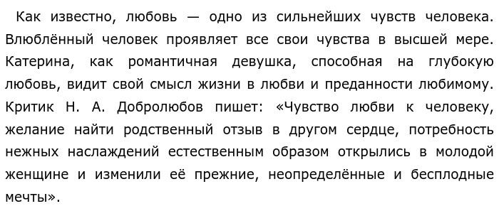 Почему «жизненная наука» Варвары не принесла счастья Катерине? по пьесе Гроза (Островский А. Н.)В драме «Гроза» Александр Николаевич Островский представляет читателю довольно много разных персонажей, и многих из них можно противопоставить главной героине — Катерине. Однако самое явное противопоставление — это сравнение персонажей Катерины и Варвары. Это две абсолютно разных натуры. У них разные характеры и, что самое главное, разные жизненные принципы. То, к чему привыкла Варвара и что считает нормальным, для Катерины неприемлемо. «Жизненная наука» Варвары — «делай что хочешь, только бы шито да крыто было». Существует ряд причин, по которым такой принцип не принёс Катерине счастья. В первую очередь нужно сравнить основные черты характера Катерины и Варвары и то, как они относятся к окружающей их реальности. Катерине присущи повышенная эмоциональность, мечтательность и романтичность. Катерина предпочитает следовать зову сердца, Варвара же мыслит логически. Катерина не хочет принимать реальность, и для неё главный способ отстранения от действительности — это фантазии, мечты. Варвара также убедилась, что живёт в окружении жестоких, суровых людей. Ей также не нравится реальность, однако она приземлённая, не умеет фантазировать. ![]()