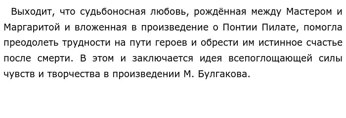 Их связало творчество, поскольку Маргарита любила не только Мастера, но и его произведение о Понтии Пилате, в которое он вложил все свои силы и душу. Женщина говорила: «в этом романе её жизнь», — и поддерживала возлюбленного, желая ему успеха. Она, не задумываясь, спасла горящие рукописи Мастера, дорожа его произведением, и настаивала в дальнейшем на том, чтобы он закончил свой роман. С общим интересом к творчеству между героями росла привязанность и любовь друг к другу. И Маргарита, будучи замужем за обеспеченного мужчину, и Мастер, женатый на женщине, имени которой он не помнит, ценят каждую минуту, проведённую вместе. Когда Мастер переживает внутренний конфликт: начинает сходить с ума, бояться всего, «бояться темноты», Маргарита готова сбежать от мужа, оставить жизнь в достатке и быть рядом с ним, чтобы поддержать и «вылечить». Даже несмотря на беспокойство Мастера о том, что они будут жить в нищете: он не желал Маргарите такой жизни, женщина всё равно готова пойти на всё ради него. Любовь и творчество неразрывно связаны друг с другом на протяжении всего фантастического романа. Чувства Мастера к Маргарите «питали» его произведение, и попытка сжечь рукописи могла убить их любовь, но герои временно расстались, поскольку Маргарита спасла несколько страниц из произведения о Понтии Пилате. Продав душу Воланду и став ведьмой на его балу, Маргарита смогла загадать желание и вернуть к себе Мастера. После их возвращения в подвал, М. Булгаков обращает внимание читателя на нежность и бережность, с которыми Маргарита рассматривала рукописи. Она боялась потерять всё, что вновь обрела спустя четыре месяца, однако желание Иешуа о вечном покое Мастера и Маргариты, воссоединяет возлюбленных навсегда. ![]() Обновлено: Опубликовал(а): Виктошка Внимание! Спасибо за внимание.